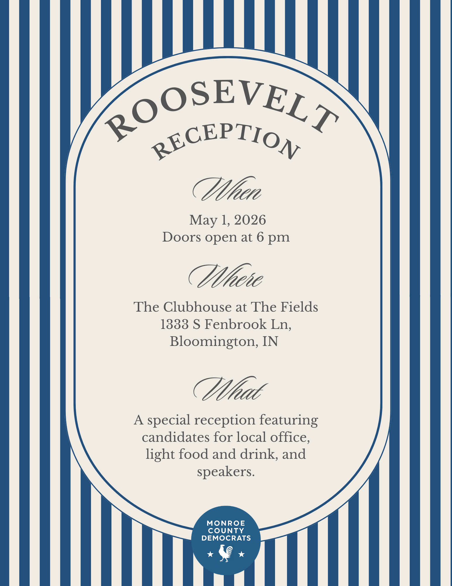 Tickets and sponsorships are now on sale for the 2026 Roosevelt Reception! Join us on Friday, May 1 at 6 p.m. at the Fields for a special pre-primary reception to kick off a busy election year ahead. We’ll gather with this year’s candidates, engage in interactive activities and important civic discourse. This is a special opportunity to get up close and personal with your 2026 Democrat candidates! Hors d'oeuvres will be served, and a cash bar is available.